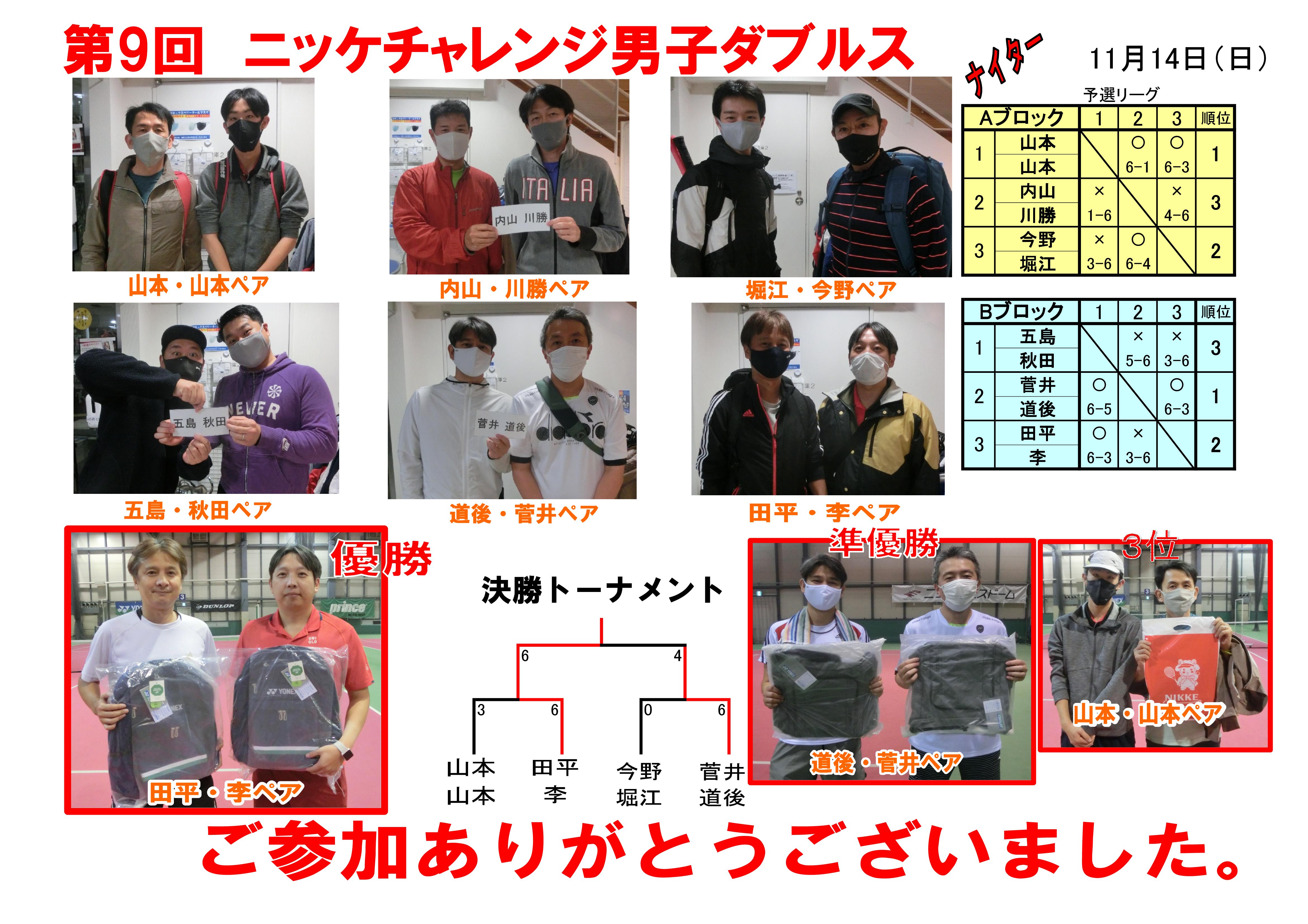 イベント&新着情報 第53期 チャレンジミックスダブルス 結果報告‼ 2021年11月21日 11/14 第9回 チャレンジ男子ダブルス 結果報告‼ 2021年11月14日 第24回 エンジョイダブルス A2&Eの部 結果報告‼ 2021年10月31日 第24回 ニッケエンジョイダブルス A1の部 結果報告‼ 2021年10月24日 10/3 チャレンジ女子ダブルス 結果報告‼ 2021年10月04日 17 / 21« 先頭«...10...1516171819...»最後 »