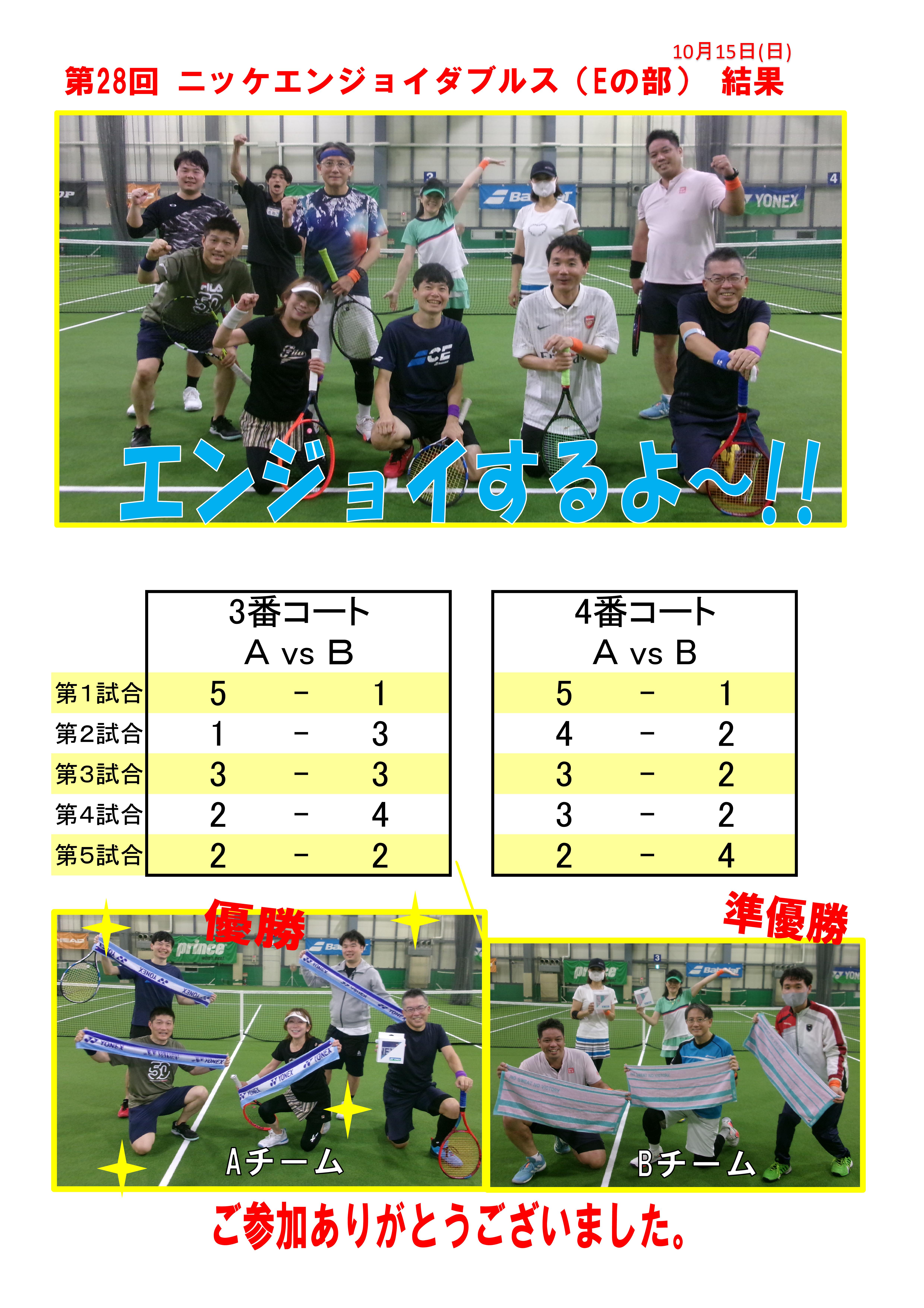 イベント&新着情報 第61期 親子レッスン 閉幕‼ 2023年10月31日 第28回 ニッケエンジョイダブルスA1の部 結果報告‼ 2023年10月22日 第28回 エンジョイダブルス Eの部 結果報告‼ 2023年10月15日 1 / 11
