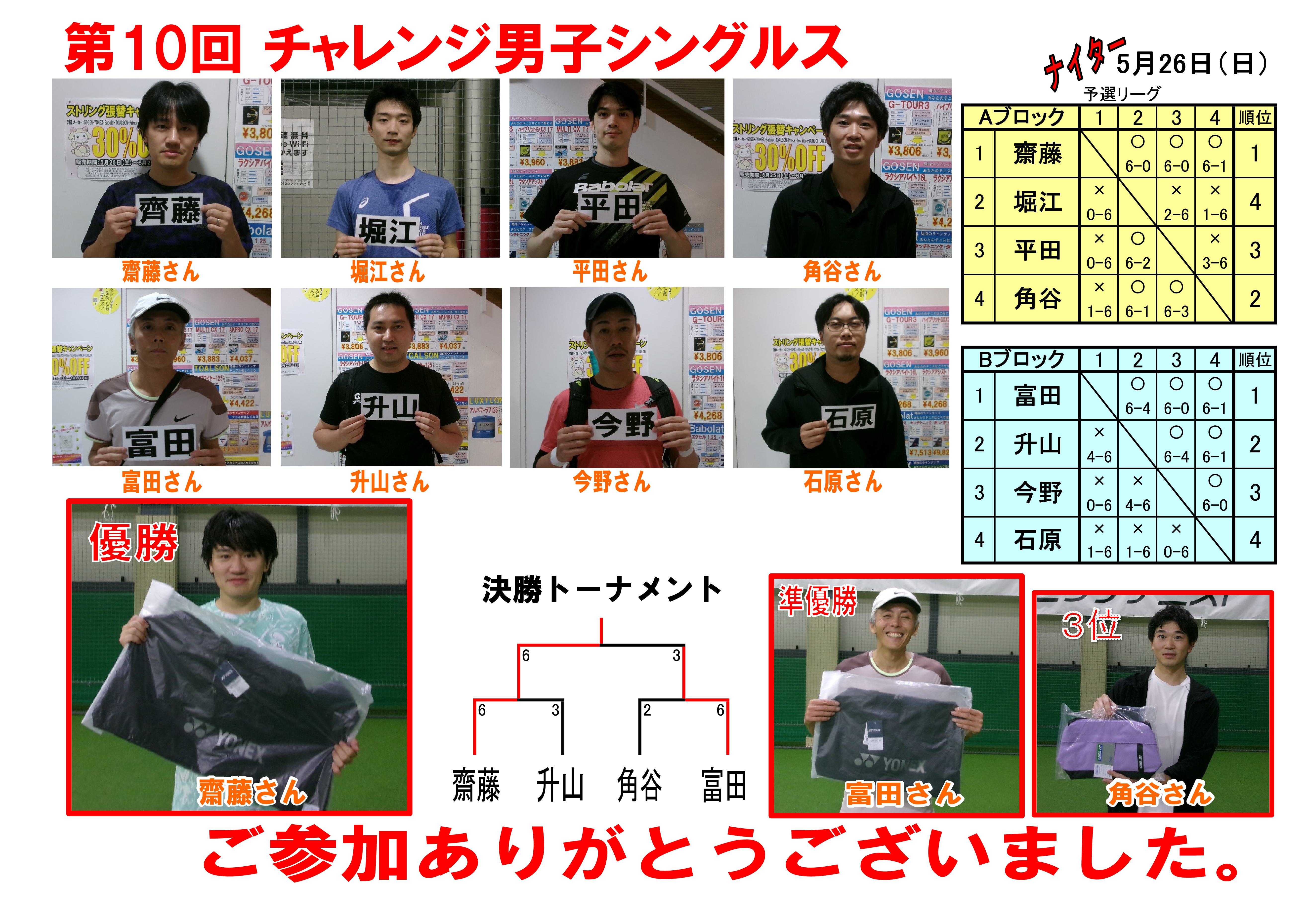第63期 第10回 チャレンジ男子シングルス 結果報告‼