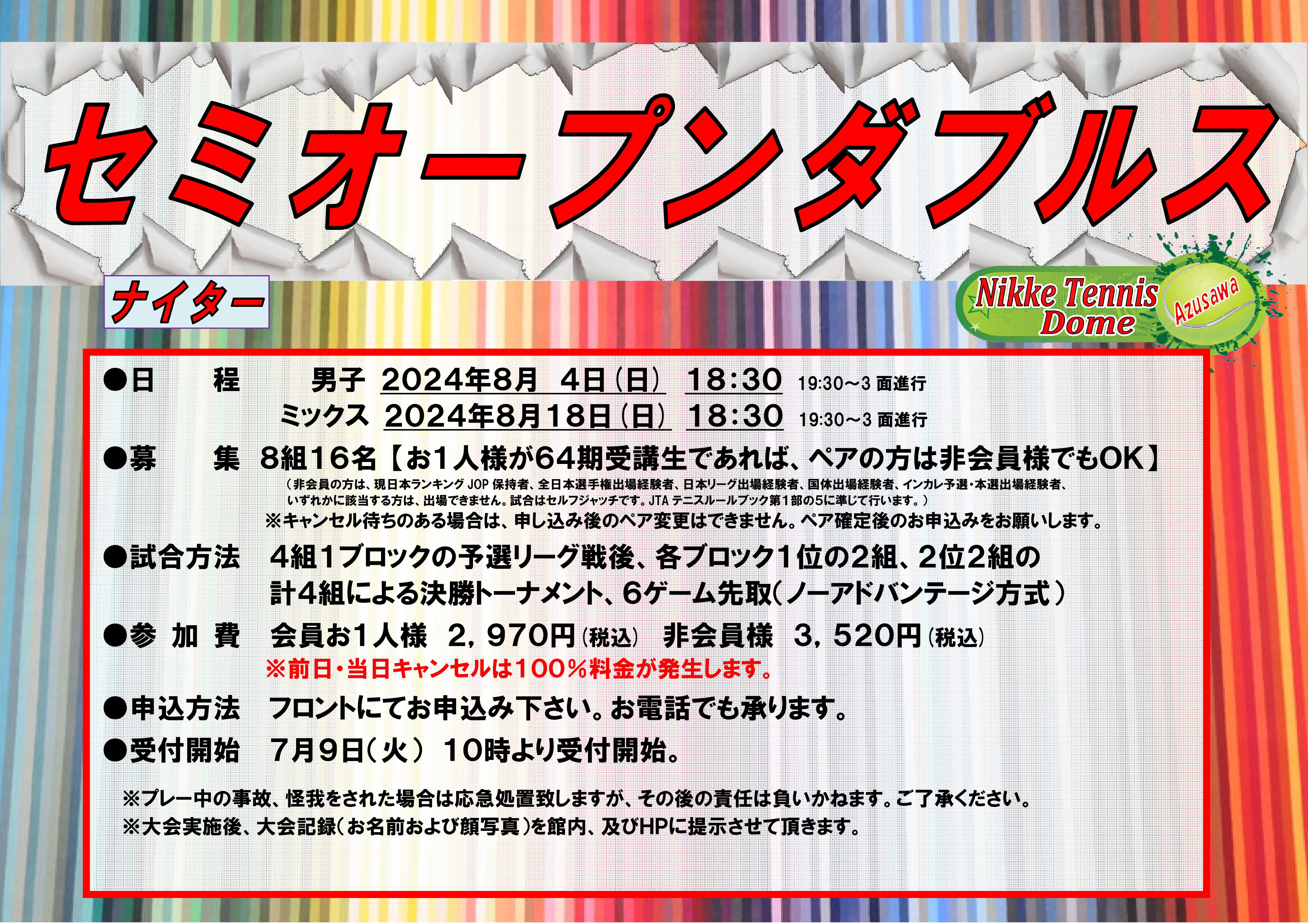 イベント&新着情報 第64期 セミオープンダブルス大会 男子&ミックス 開催‼ 2024年07月07日 « ビギナー&ベーシック補講「ゲームデビュー」募集中‼ 夏休みの朝に集まれ!ジュニア朝練 開催‼ »