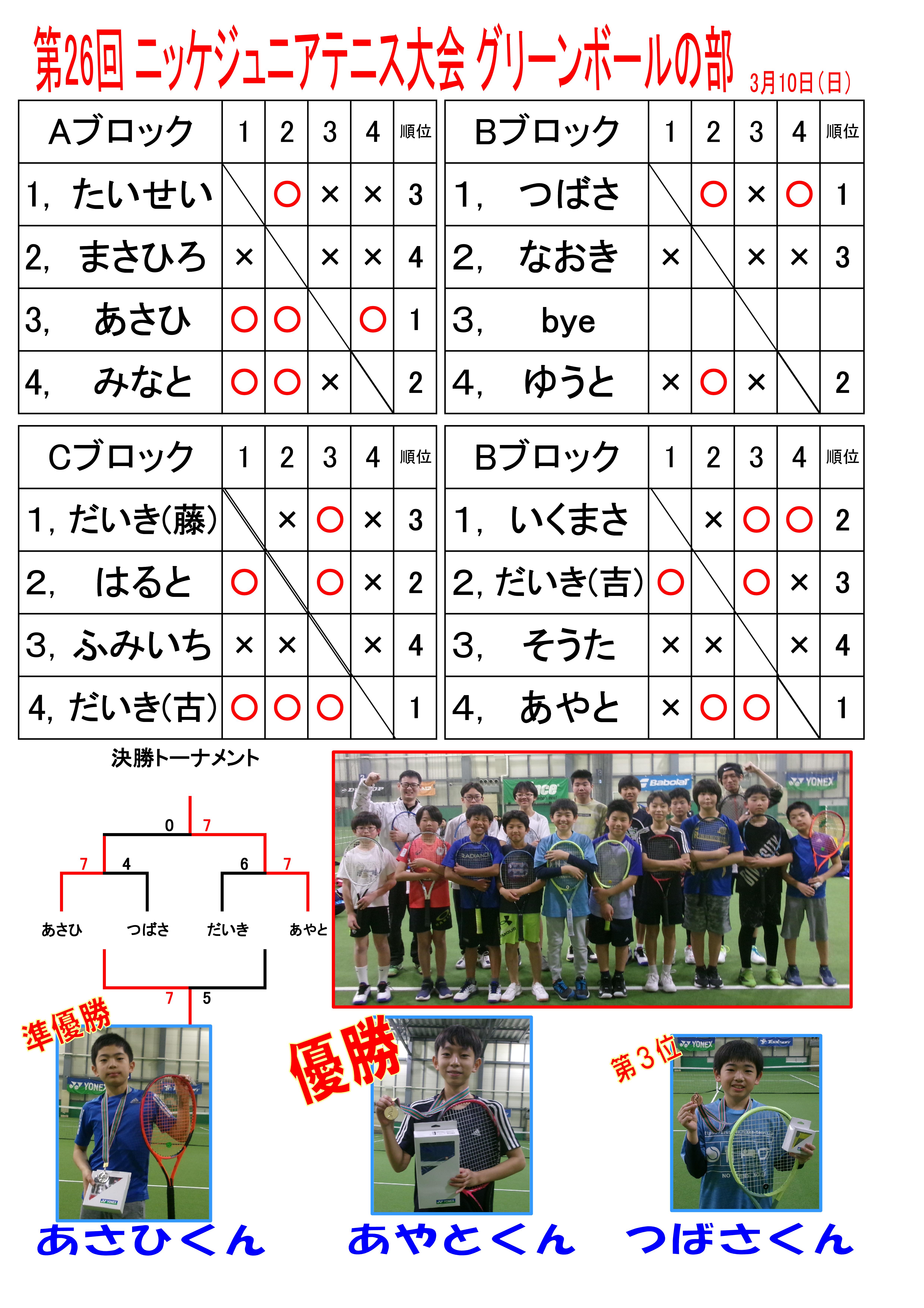 イベント&新着情報 第63期 コーチInゲーム練習会 日程‼ 2024年03月26日 第26回ニッケジュニア大会 イエローボールの部 結果報告!! 2024年03月17日 第63期(4 5 6月期) イベント告知 「ゲーム練習会」日程‼ 2024年03月14日 第26回 ジュニアテニス大会 グリーンボールの部 結果報告‼ 2024年03月10日 当日の試合の様子はこちらから 2番コート 4番コート 第26回 ジュニア大会 オレンジボールの部 結果報告‼ 2024年03月04日 当日VTR 4番コート 2番コート 5 / 29« 先頭«...34567...1020...»最後 »